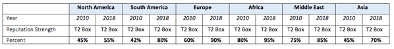 Every once in awhile when I’m in a rut, I force myself to come up with a bunch of different visualization options for a single set of data. At first its seems daunting… but if you push yourself (and you have a little time), you’ll be amazed at what you can create. Below is an example of a simple set of trended data for a hypothetical global reputation study: