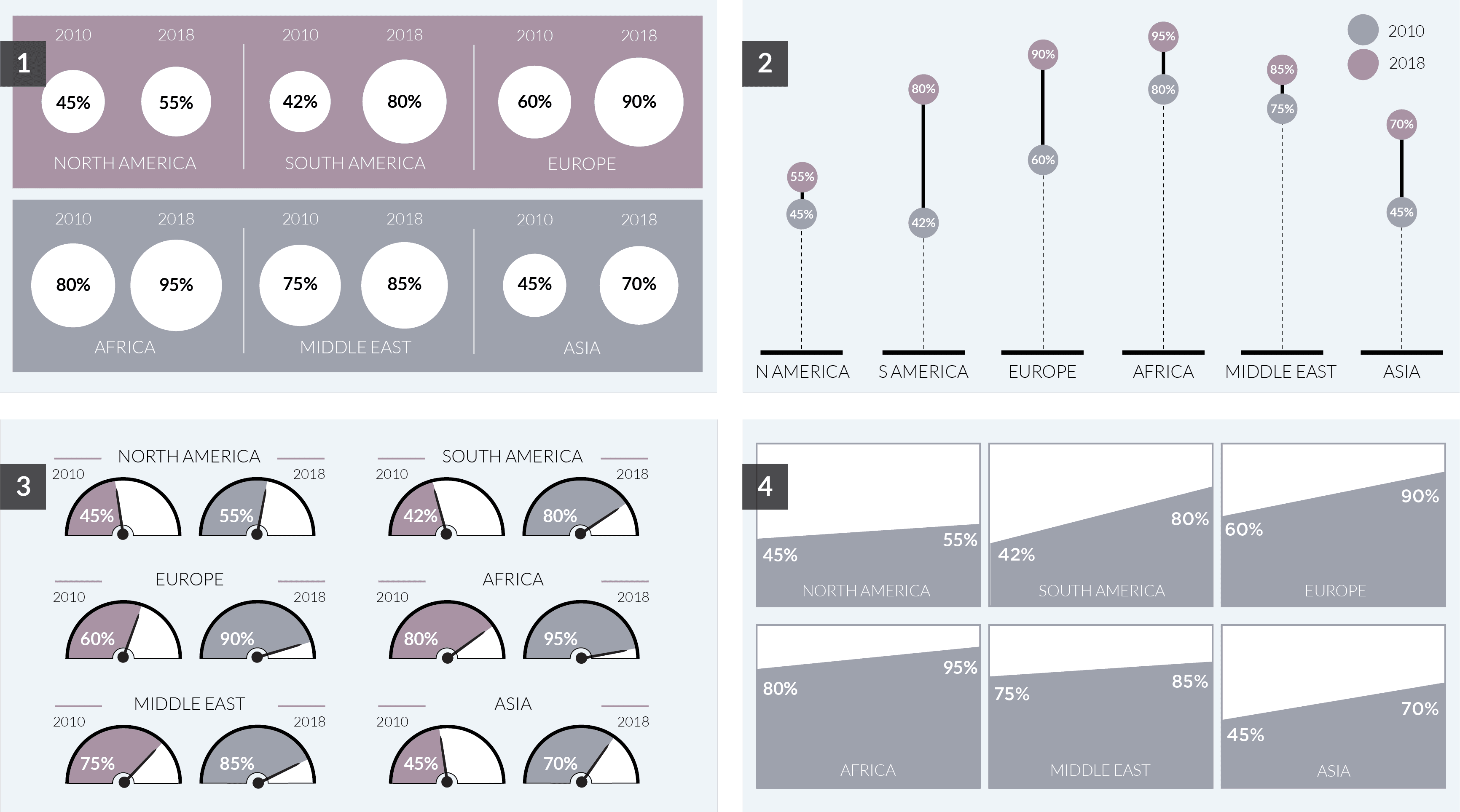 Here are my final four ideas from the top table. These all assume our goal was to show change in all markets evenly, allowing our audience to quickly digest our progress from 2010-2018.