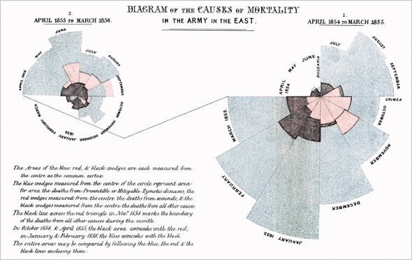 While not as simple as Playfair, her message — that more soldiers died from preventable infections than from wounds — is clear and spurred people to acknowledge sanitation problems and actively work to improve sanitation conditions in hospitals. From this, we learn that great visualization can have a real-world impact when we use data to highlight a distinct problem.