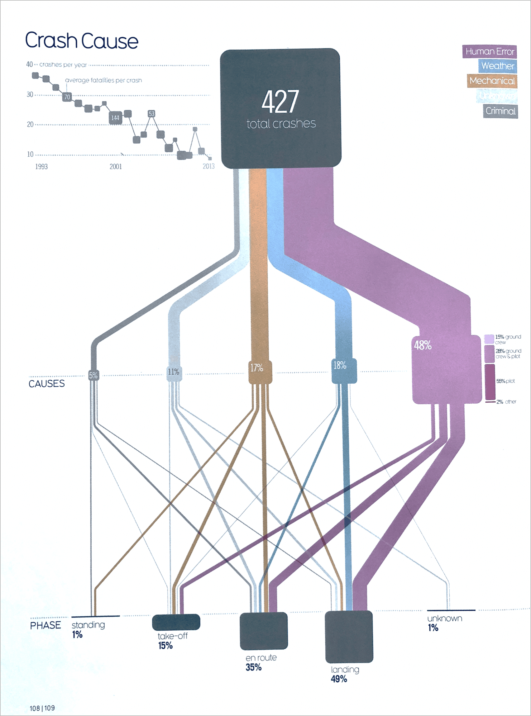 There is a time series plot that appears in the upper left, showing the dropping rate of airline crashes. The main portion below presents information about the causes of commercial air crashes from 1993–2013. In addition to the cause of the crash, McCandless shows the "phase of flight" (take-off, en route, landing) during which the disaster occurred.