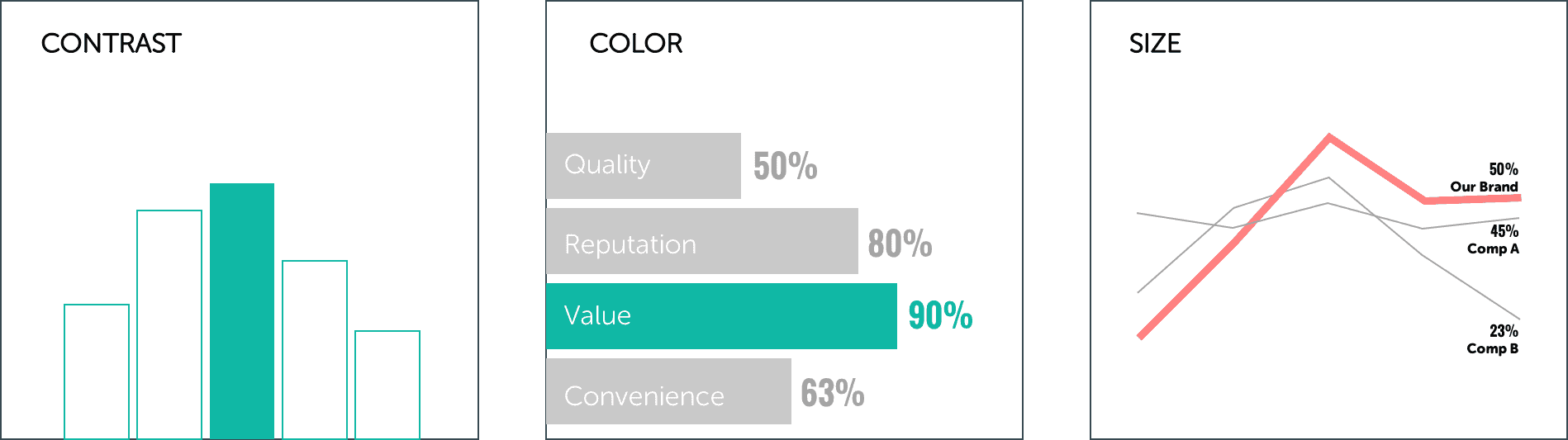 You can do this with a variety of specific elements like color, size, and texture. Below are a few examples of how you can make certain parts of your data stand out: